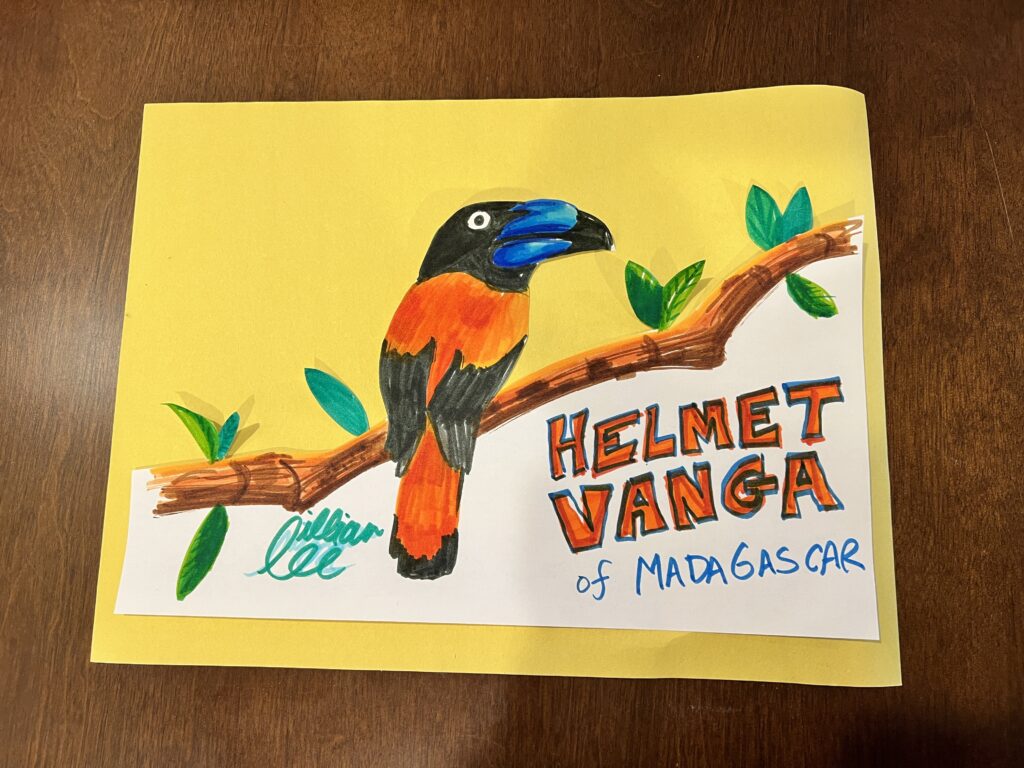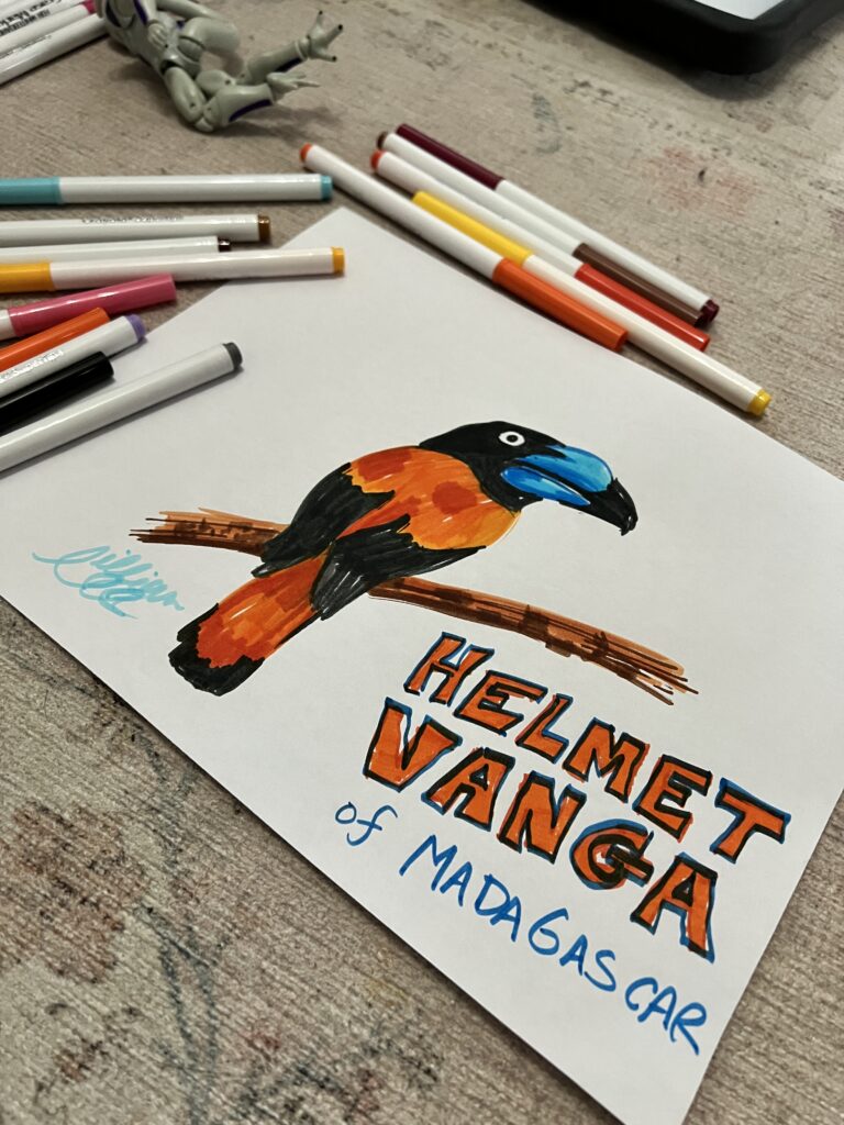 The kiddo wanted to make some drawings together so he gathered some Crayola markers and printer paper. While he worked on Pokémon drawings, I opted for the Helmet Vanga bird from Madagascar — it looks so striking. I played around with it some more and cute off the top half and placed it on a sheet of yellow construction paper.