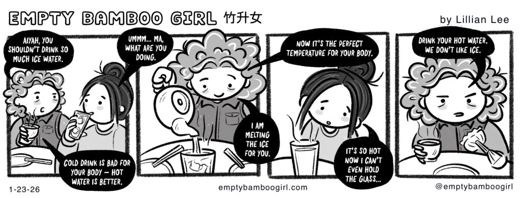My latest comic in the Sampan Newspaper is one of my faves. I’m really happy with how it turned out and the subject matter. Hot water is good – ICE is bad.
