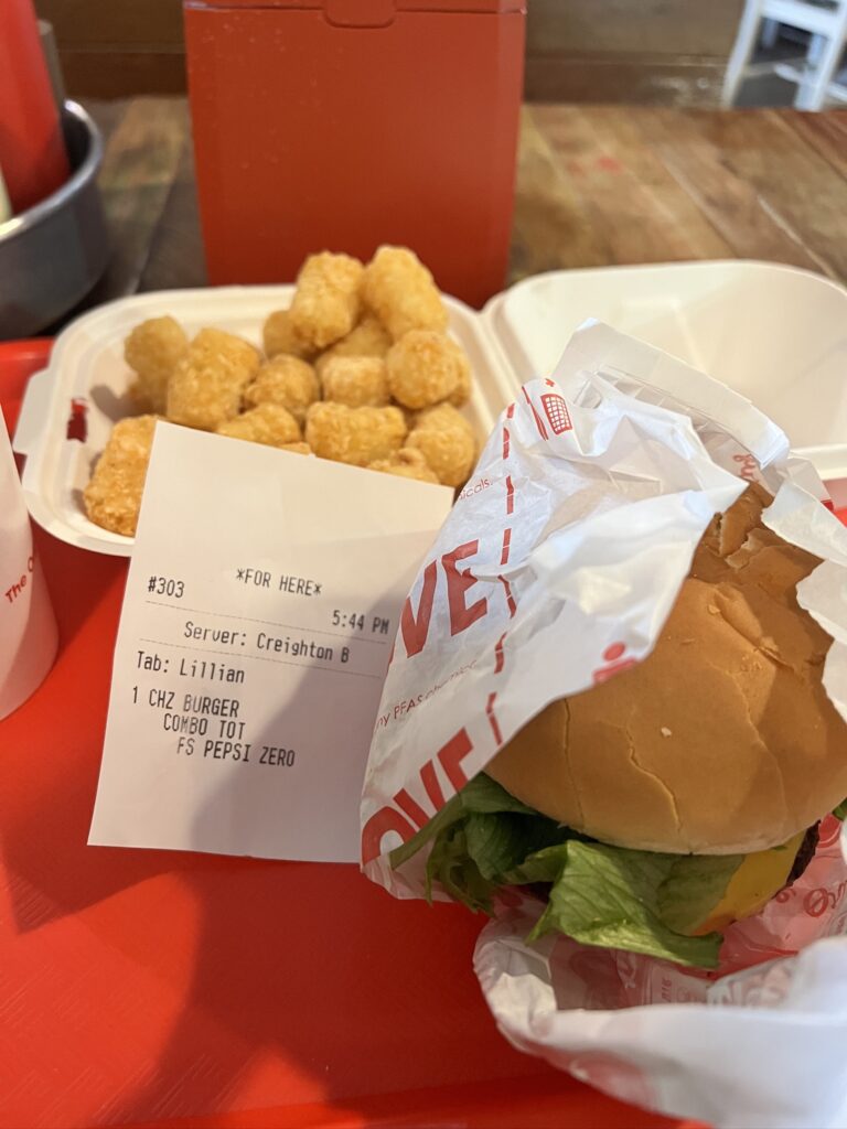 Thank goodness there’s a Tasty Burger in the subway station. I decided to grab an early dinner and hunker down until the issues cleared up. I parked myself at a booth and enjoyed a cheeseburger (cooked medium), tater tots and a Pepsi Zero – it was SO good.